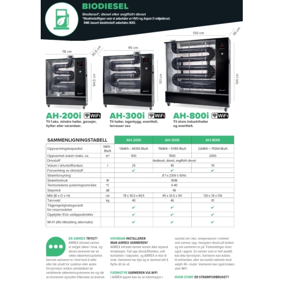Den infrarøde varmeren Airrex AH-200i med WiFi har fått et helt nytt design. Airrex 200i er vår mest kompakte dieselvarmer. Den er svært godt egnet til oppvarming av lokaler som hytter, garasjer, glassverandaer, arrangementstelt eller drivhus.